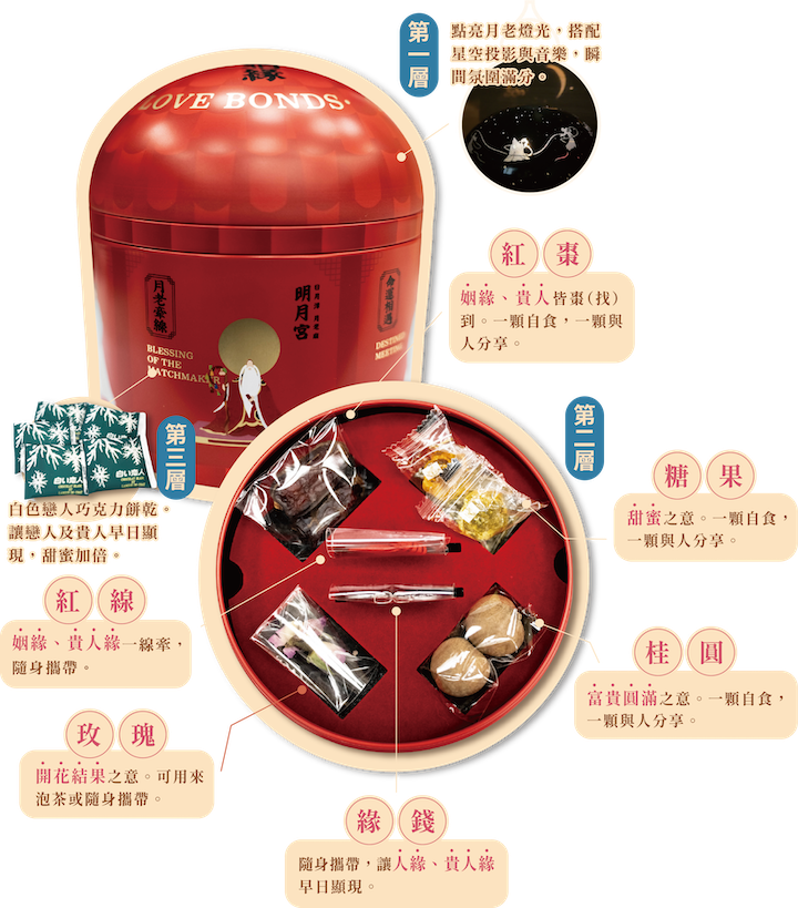 「姻緣六禮」是為了向月下老人祈求良緣特別準備的祭品。信眾以虔敬心,藉由姻緣六禮向月老稟告心願,祈求姻緣、人緣、貴人緣皆能圓滿顯現。