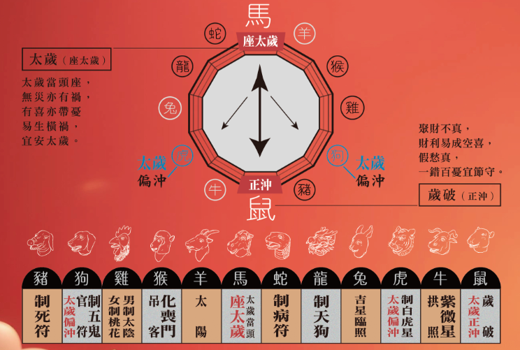 在 太 歲 吉 凶 也 就 是 不 同 ⽣ 肖 的 ⼈ 在 當 年 度 會 沖 犯 到 不 同 的 狗 的 ⺠ 眾 上 , 還 有 「 流 神 煞 , 以 就 是 偏 沖 , 此 年 ⼗ ⼆ 神 煞 四 種 」 的 丙 午 年 ( 1 1 5 年 ) 來 說 , 各 ⽣ 肖 之 神 煞 分 別 為 ⾺ : 太 歲 ( 座 太 歲 ) 、 ⽺ : 太 陽 ( 晦 氣 ) 、 猴 : 喪 ⾨ 、 雞 : 太 陰 ( 歲 刑 ) 、 狗 : 五 ⿁ ( 偏 沖 ) 、 豬 : 死 符 、 鼠 : 歲 破 ( 正 沖 ) 、 ⽜ : 龍 德 ( 歲 煞 ) 、 虎 : ⽩ 虎 ( 偏 沖 ) 、 兔 : 福 德 ( 絞 煞 ) 、 龍 : 天 狗 ( 弔 客 ) 、 蛇 : 病 符 。